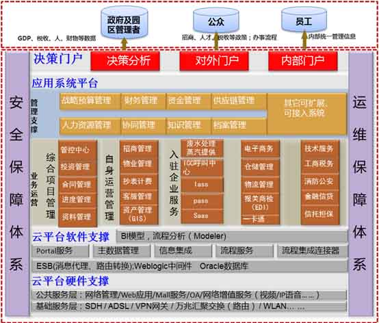 通过建立园区公共云服务平台,满足入驻企业日常信息化管理的需求,并最大程度降低入驻企业信息化在硬件环境(IAAS)、开发测试环境(PAAS)、 应用环境(SAAS)方面的成本 。根据企业的类型、规模大小等不同,提供个性化的IT服务,并让企业进驻后专注核心业务的经营及管理。