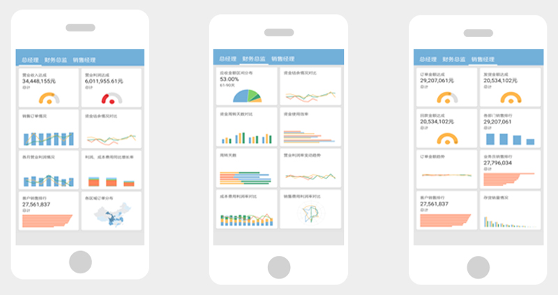 为管理者提供个性化经营数据看板,企业收入、成本费用、利润、资金、回款、盈利能力一目了然
