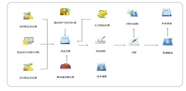 资金流向追溯;业务往来核算;收付款计划;成本核算;工资核算与发放;企业资产动态管理;固定资产折旧与处理;财经报表编制;财务决策分析。